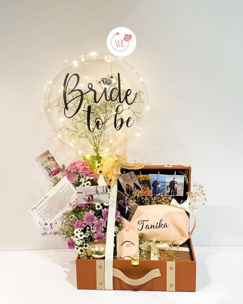 From dainty daisies and handwritten letters to keepsake photos and blush-toned treasures, every detail feels like a love note. The glowing “Bride to Be” balloon adds that little spark — the kind that lights up a bride’s heart as she counts down to her forever.