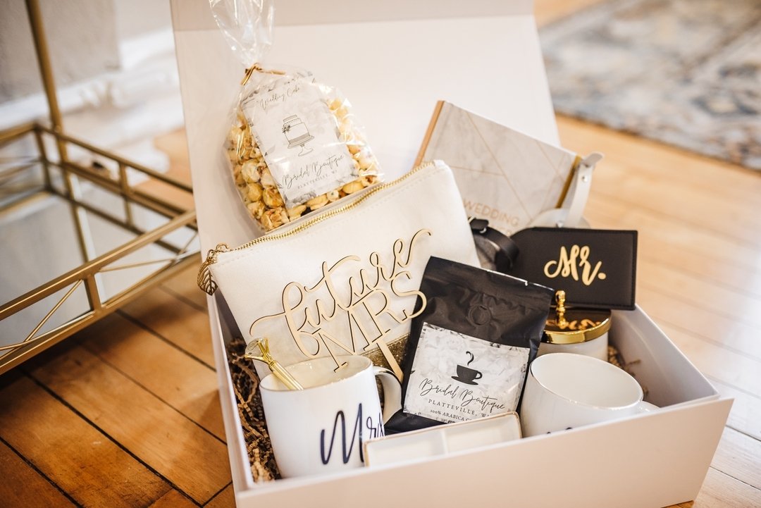 @bridalboutiquewi knows exactly how to spoil a bride-to-be — this chic box feels like a pre-wedding hug wrapped in gold accents. With goodies like caramel popcorn, personalized mugs, cozy coffee blends, and a “Future Mrs.” clutch, it’s the perfect mix of celebration and everyday magic.