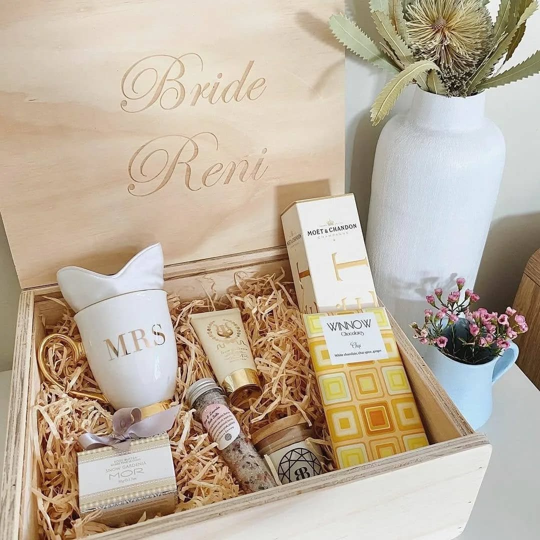 This beautiful box from @thebridalboxco feels like sunshine in a keepsake. Between the gold-detailed “Mrs” mug, luxe hand cream, artisanal chocolate, and a little Moët for toasting, it’s everything a bride needs for a cozy, joy-filled celebration.