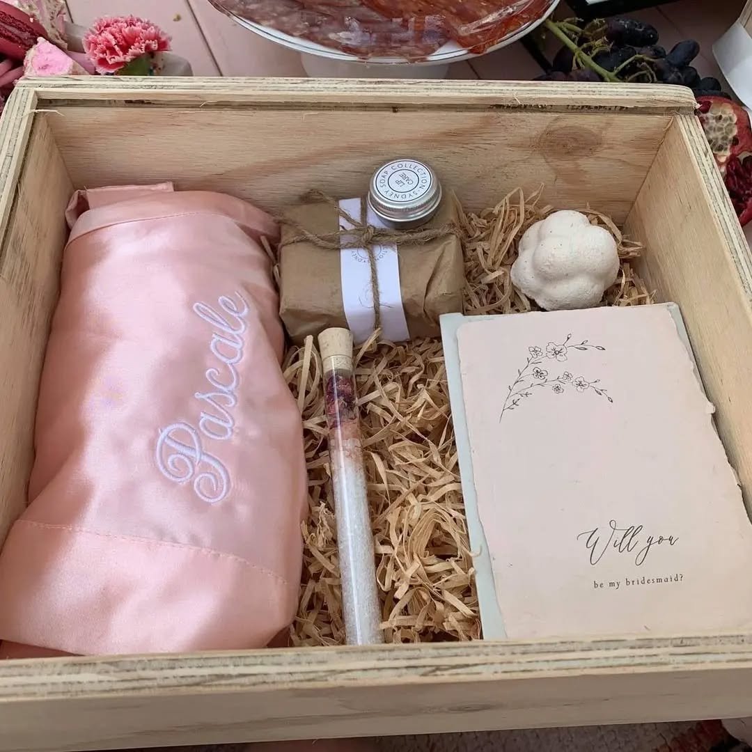 There’s something so tender about this keepsake box from @thebridalboxco — it feels like a handwritten love letter in gift form. The silky personalized robe, dainty bath treats, and delicate “Will you be my bridesmaid?” note all tucked into rustic wood just hit a different kind of sweet.
