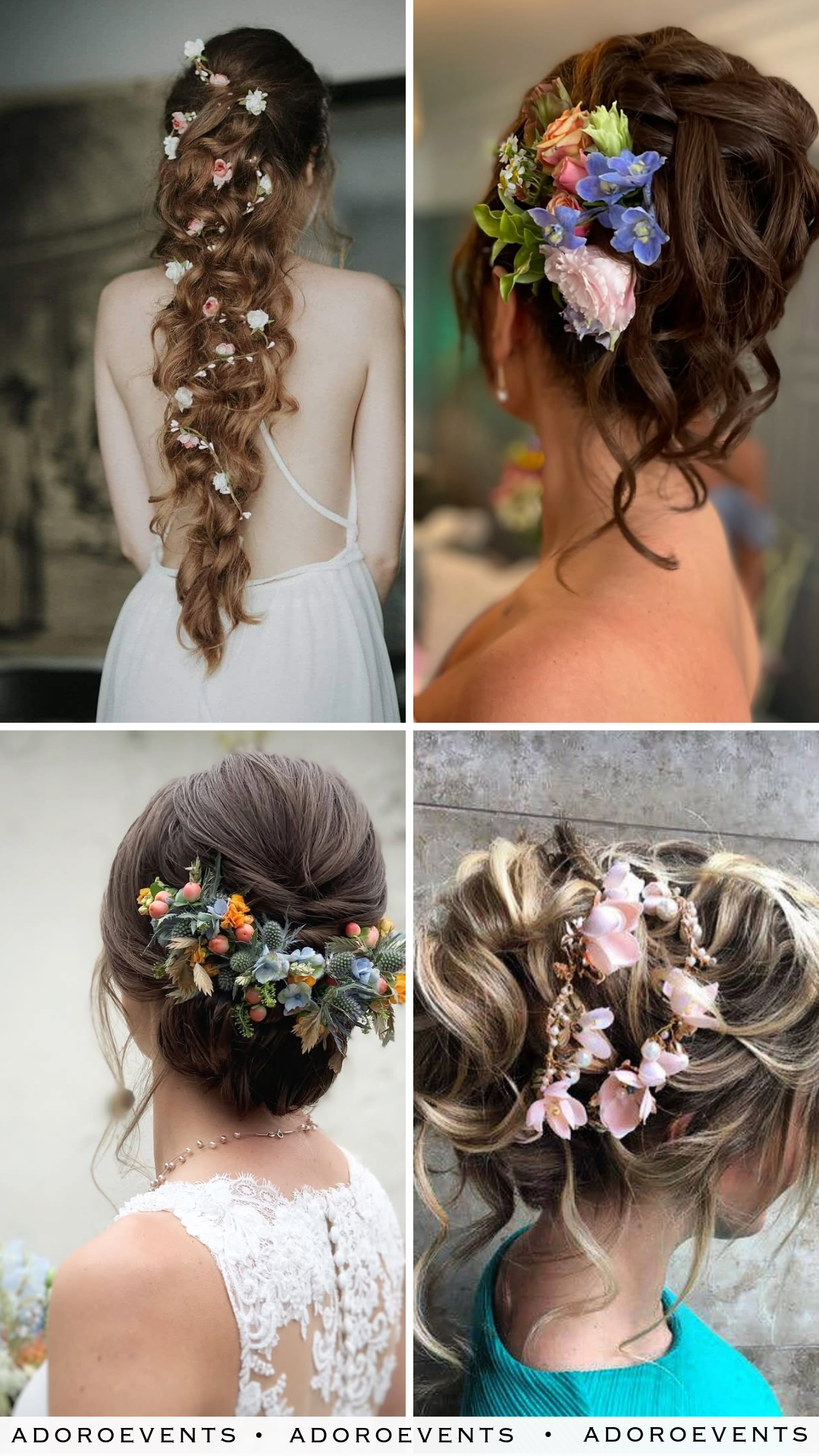 There’s something absolutely magical about flowers tucked into bridal hair they bring freshness, romance, and a fairytale glow that no accessory can match. Imagine soft waves wrapped in baby’s breath, a tousled bun dotted with orchids, or a cascading braid woven with roses in full bloom. Every petal adds a whisper of whimsy and elegance, turning your hair into a living masterpiece made for the aisle.