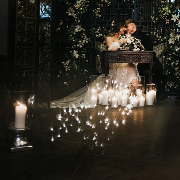 If romance were a room, this would be it. Surrounded by cascading florals and the soft glow of what must be a hundred candles, this moment feels like a scene from a dark fairytale. Not the scary kind—the kind where love is whispered in low light and every flicker holds a secret.
