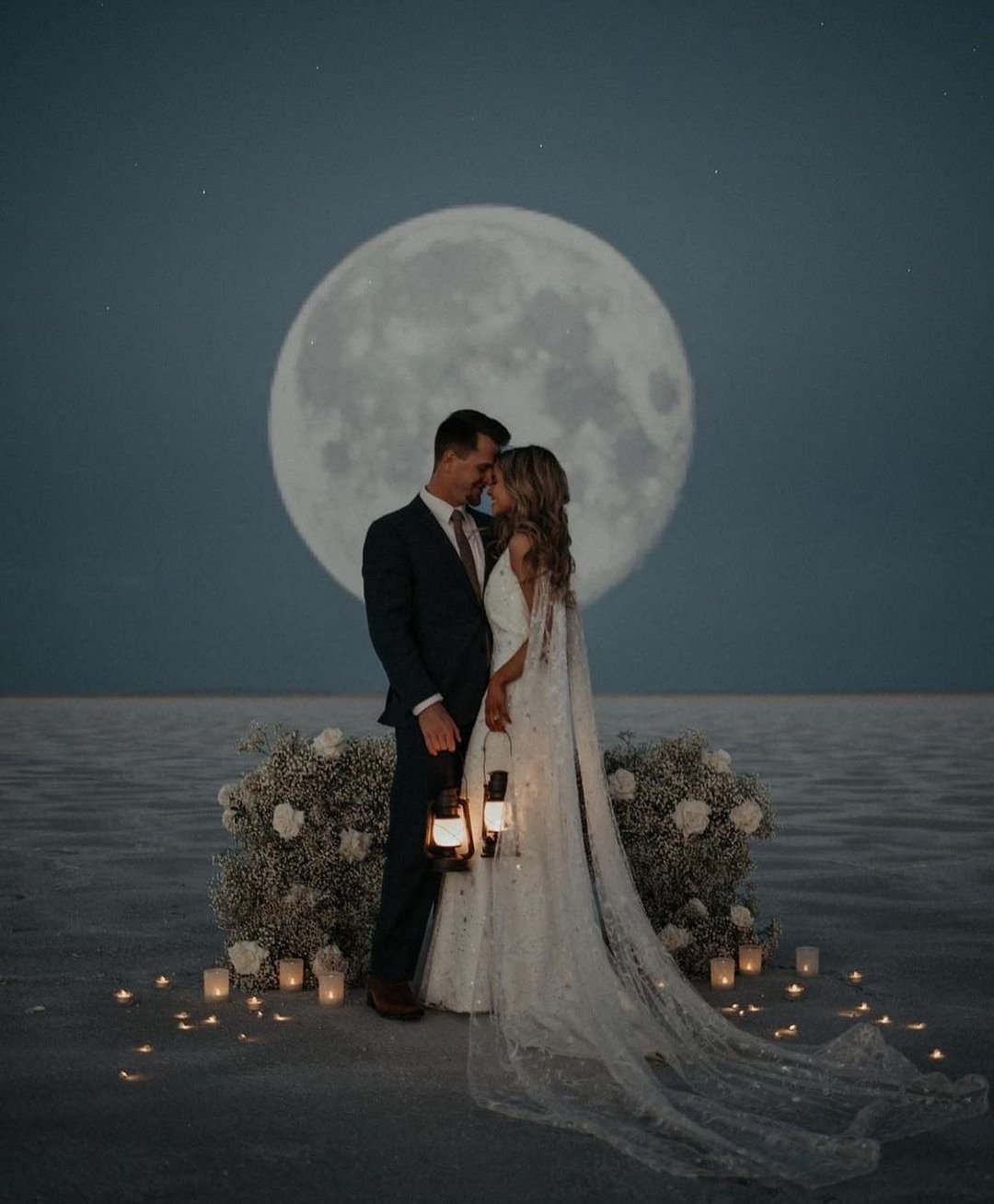 A giant glowing moon. Candles scattered like stars. And two lovers in the quiet middle of it all. This photo is hauntingly beautiful, like something pulled from an epic love poem.