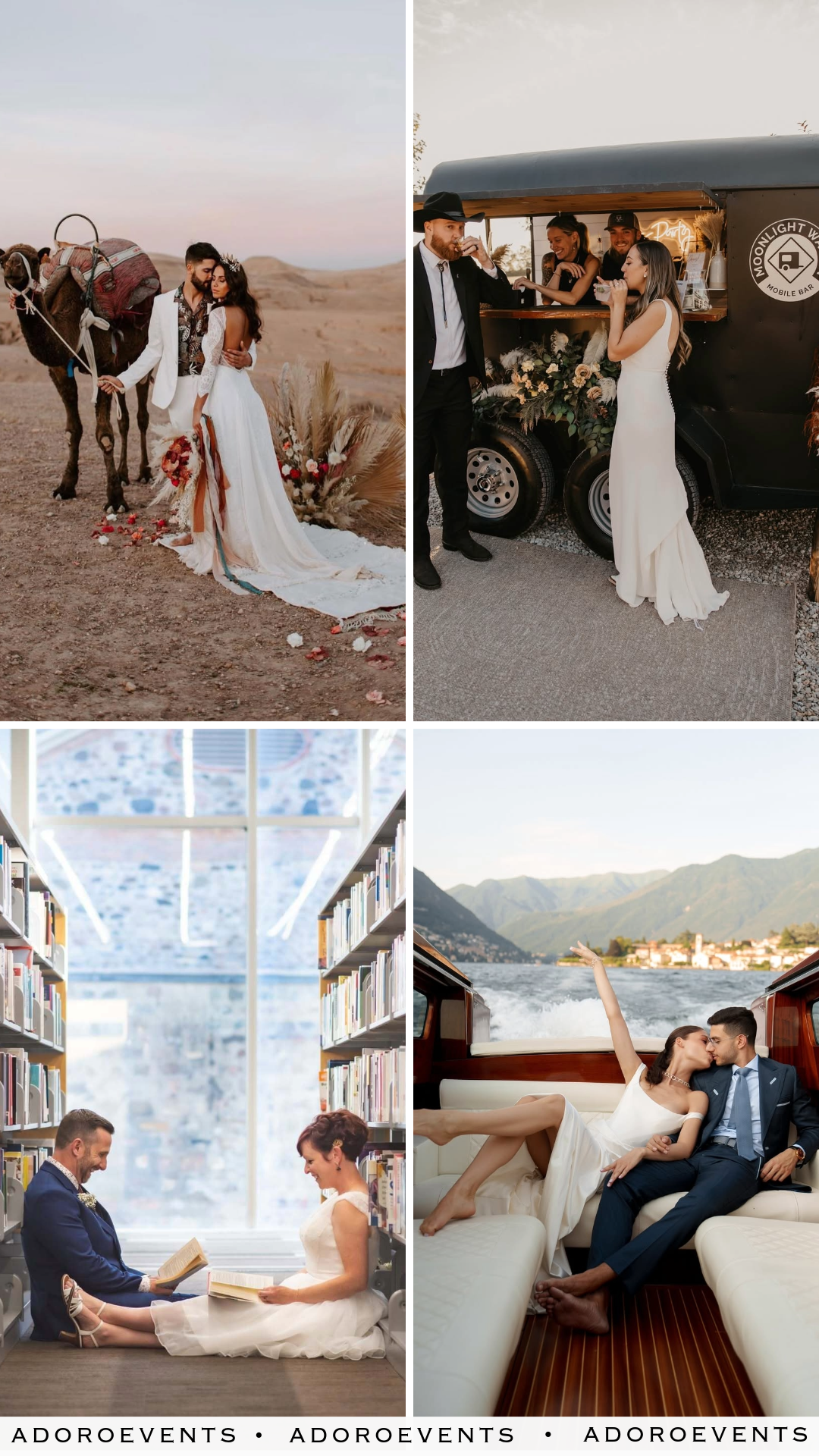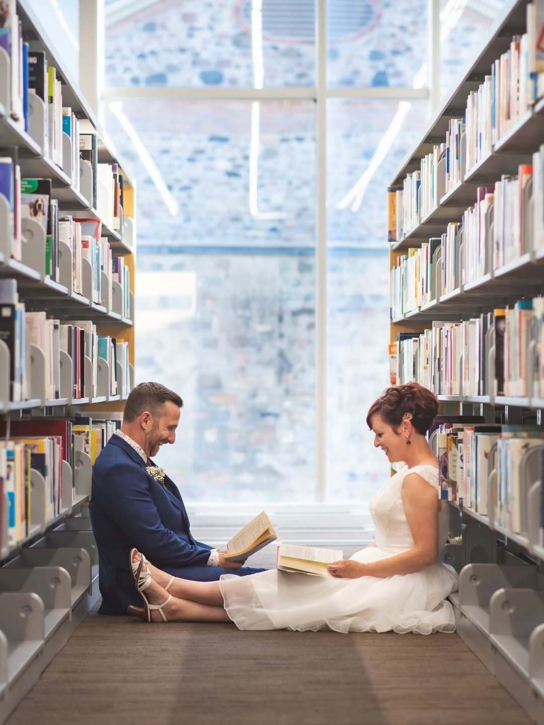 Introverts, rejoice—this one’s for us. A couple tucked into the quiet of a library, in wedding attire, reading books to each other? It’s impossibly charming. There’s no grandeur or glitter, just a soft, shared joy.