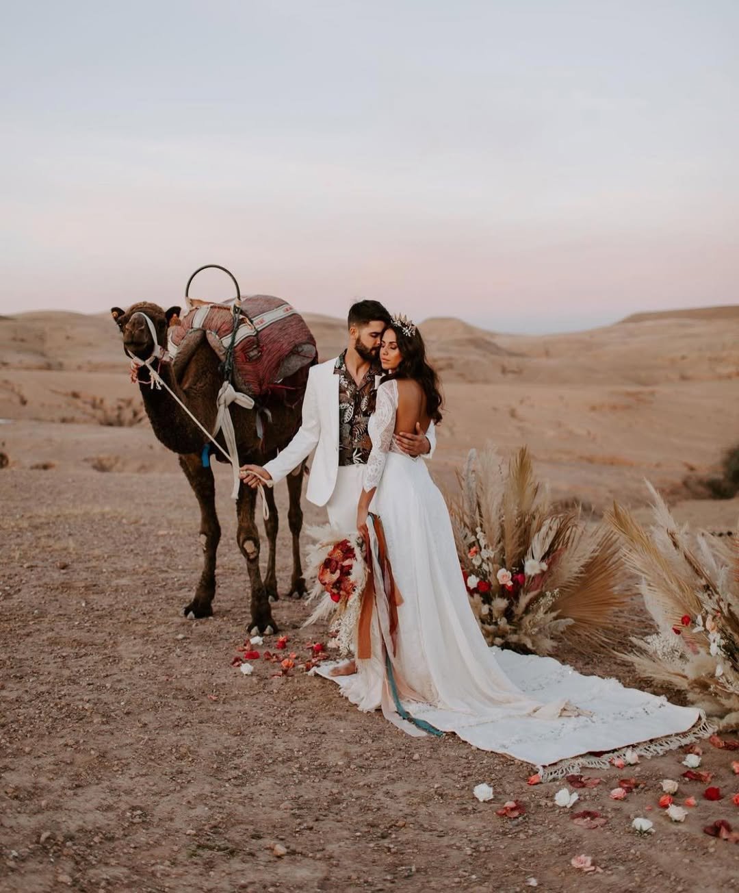 A bride, a groom, and… a camel? Yes. And somehow it completely works. With pampas grass, earthy blooms, and a palette that echoes the sand, this desert elopement is straight fire.