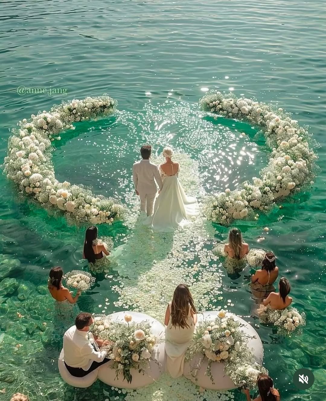Now this? This is what fairytales are made of. A bride and groom walking a petal-strewn aisle… in the middle of turquoise water. It’s surreal, ethereal, and outrageously beautiful. The floral arch encircling them like a spell—it’s not just a ceremony, it’s a dream sequence.