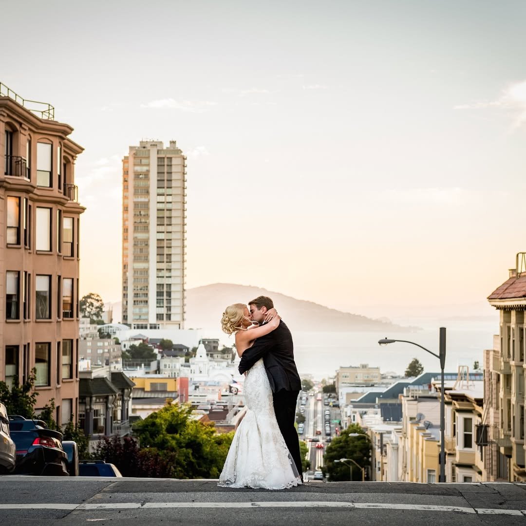 There’s something cinematic about this San Francisco shot—like the climax of a classic rom-com where they finally find each other. The way the couple stands at the crest of a hill, city cascading behind them, wrapped in soft golden light—it’s tender, triumphant, and a little bit timeless.