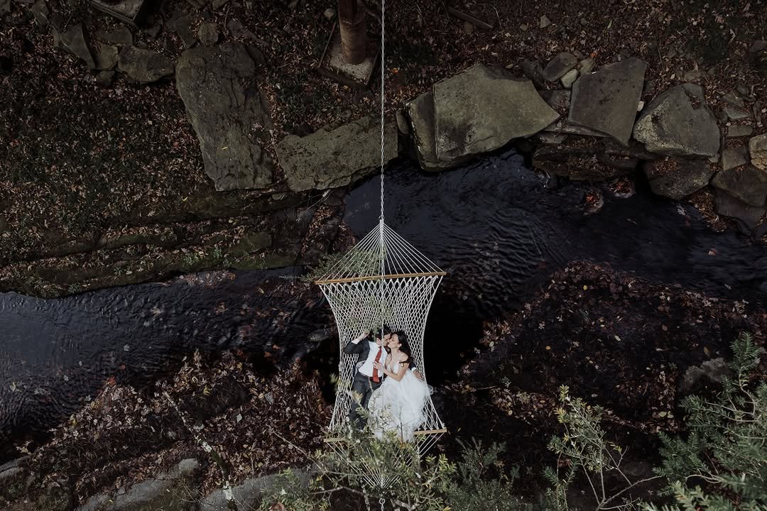 This aerial shot had us do a double take—in the best way. A couple curled up in a hammock, suspended above a creek bed? It’s adventurous and tender all at once. The muted palette of the forest floor frames the couple like a soft vignette.