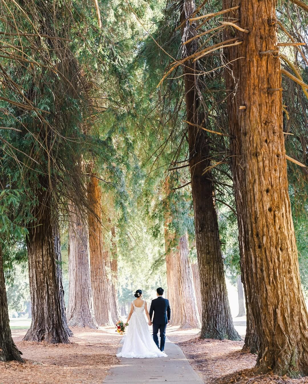 There’s something sacred about this walk. Towering redwoods line the path, light trickles through the branches, and the couple strolls hand-in-hand like they’ve stepped out of a fairytale.