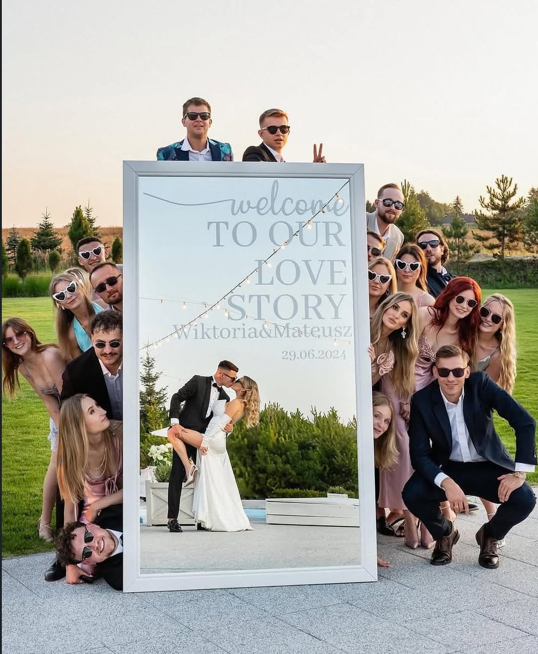 Okay, this is fun. A giant welcome sign mirror turns into a creative frame-within-a-frame moment—bride and groom in the reflection, guests popping out from behind it like a Vogue-meets-yearbook mashup.