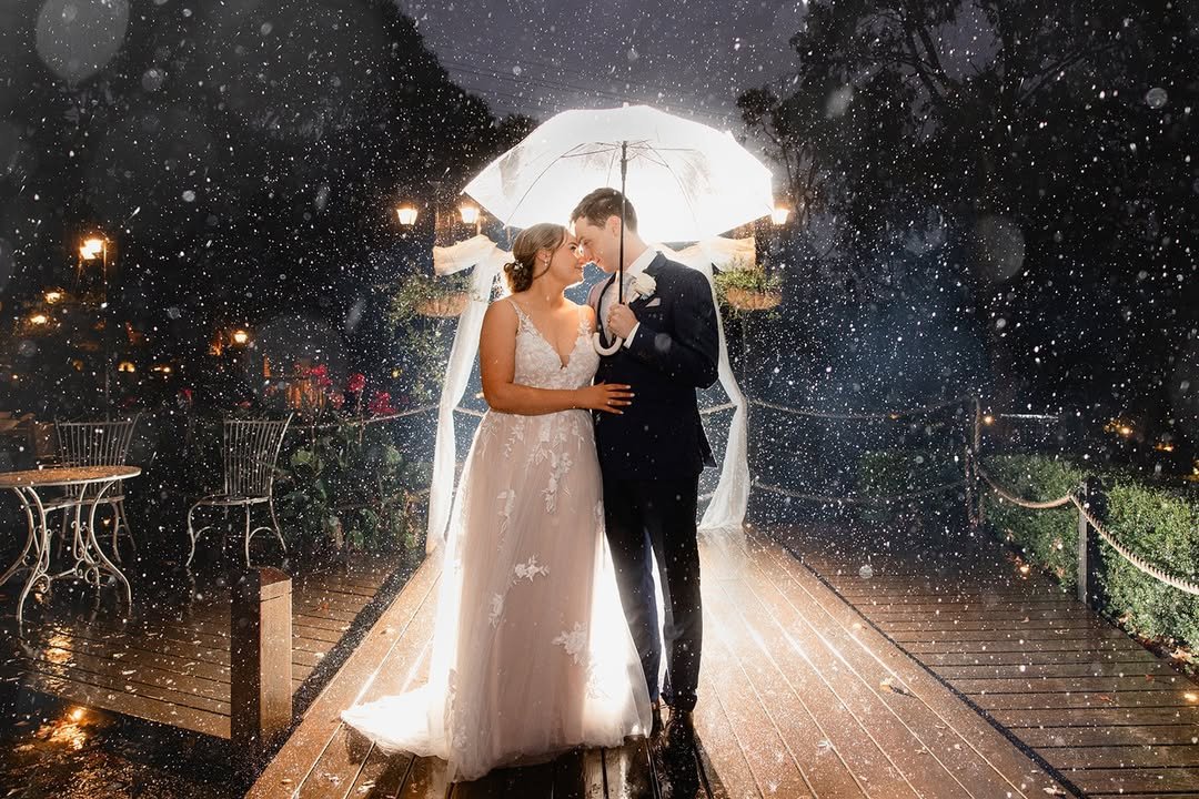 Rainy weddings get a bad rep, but this photo makes a very strong case for embracing it. The backlit umbrella, the soft sheen of the raindrops, the way the bride’s dress clings just slightly—utterly cinematic. It’s like a Nicholas Sparks moment but real.