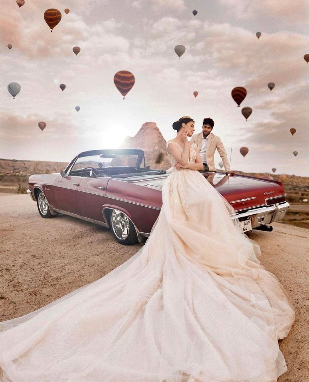 This one feels like a dream sequence. A vintage convertible, a champagne-colored ball gown that flows for days, and hot air balloons drifting across a peachy sky—it’s giving “runaway royals meet Wes Anderson.”