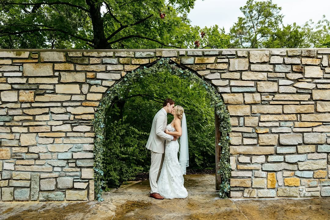 Stone archways, ivy trails, and soft filtered light set the scene for a kiss that feels both classic and wildly romantic. It’s got that storybook elegance—timeless without being too polished.