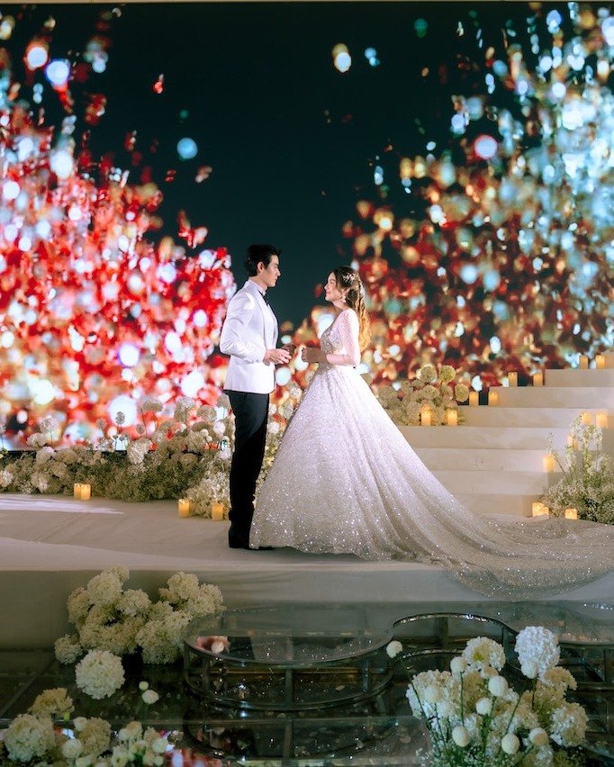 It’s luxury meets spectacle. The floral arrangements and soft candlelight anchor the glam with romance, and the whole thing reads like a couture editorial that just happens to be a real love story.