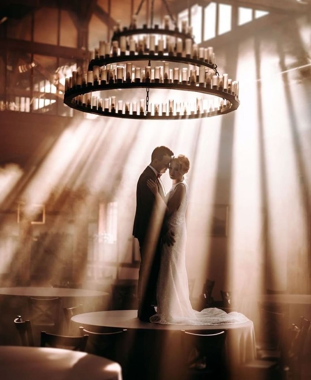 This is drama in the best possible form. A couple stands center stage on a table beneath a cathedral-style chandelier, beams of light cutting through dust and stillness like a scene from a ballet.