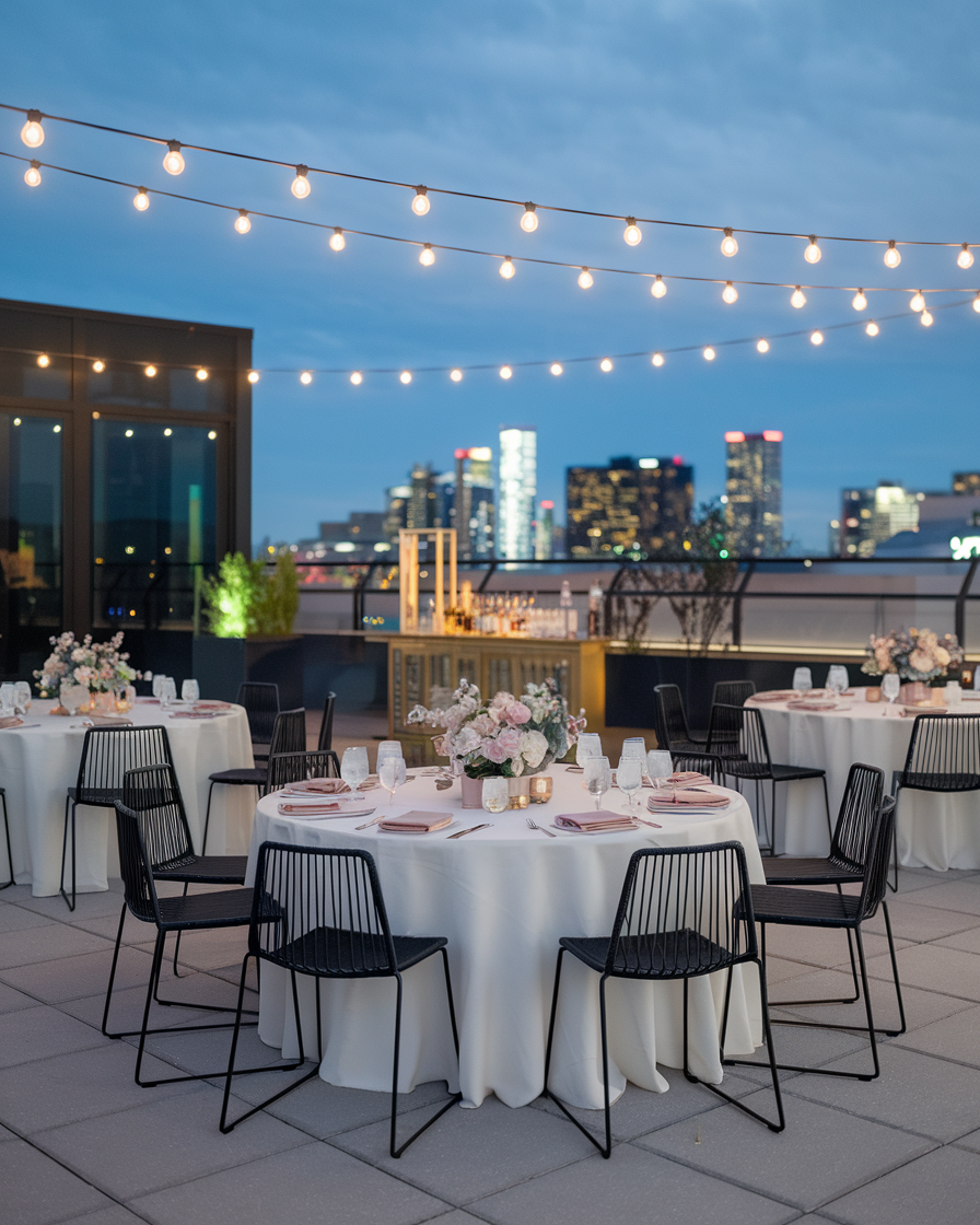 You know I love a rooftop moment—and this one? It’s effortlessly cool. Minimalist black chairs, soft blush florals, and skyline views that basically say, “Yeah, we did that.”