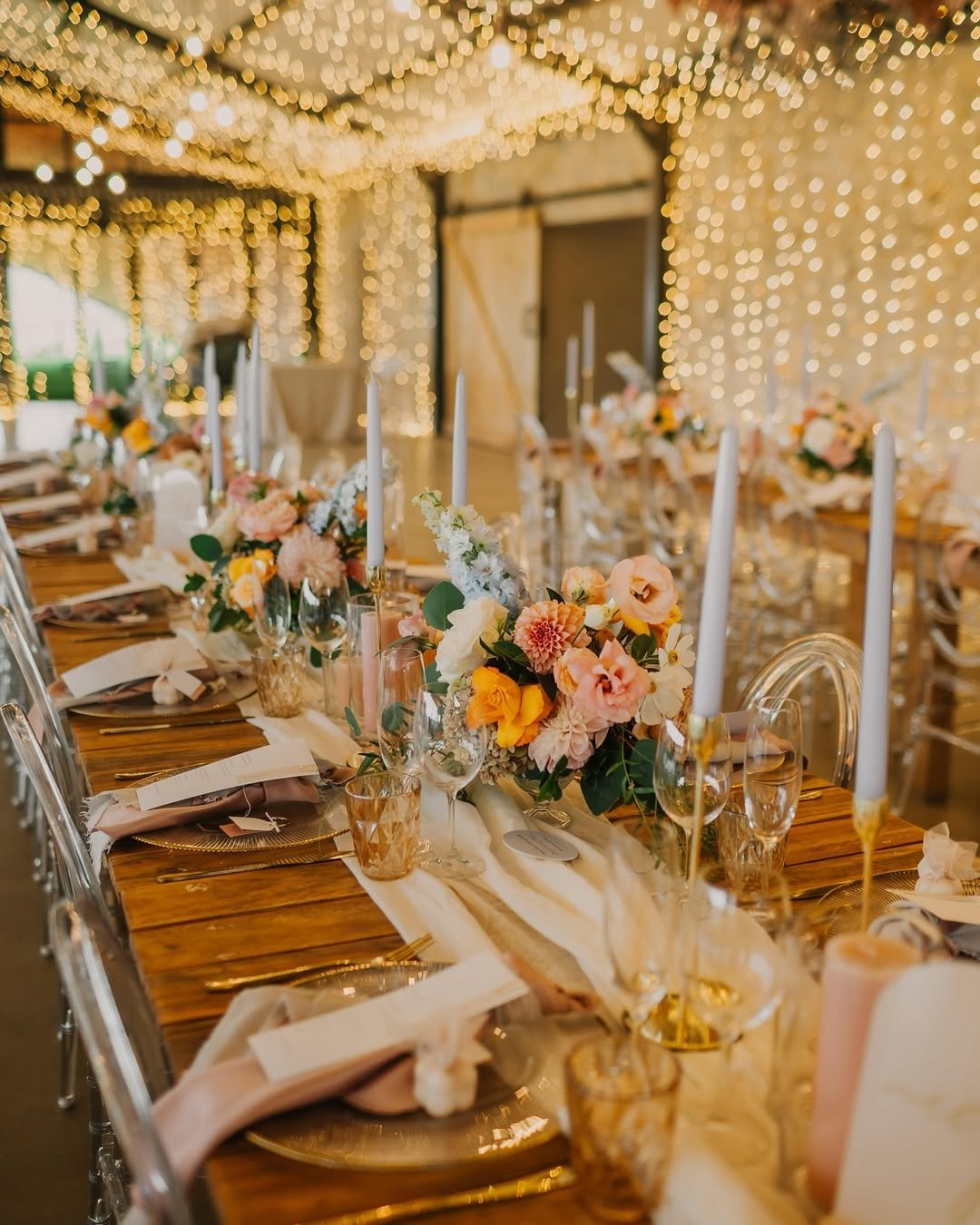 I couldn’t stop staring at the way the florals danced down the wooden table—peachy garden roses, blush lisianthus, pops of marigold… it’s giving painter’s palette meets slow romance. Add in those gold chargers and soft linen napkins tied just-so? Obsessed.