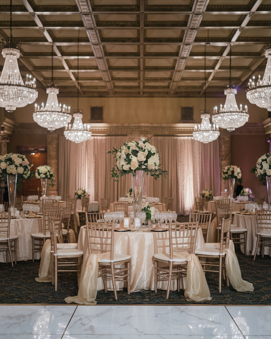 Now this is what I call a chandelier moment. Between the gilded ceilings, champagne-toned linens, and those towering ivory arrangements, this reception is practically humming with old-world glamour.