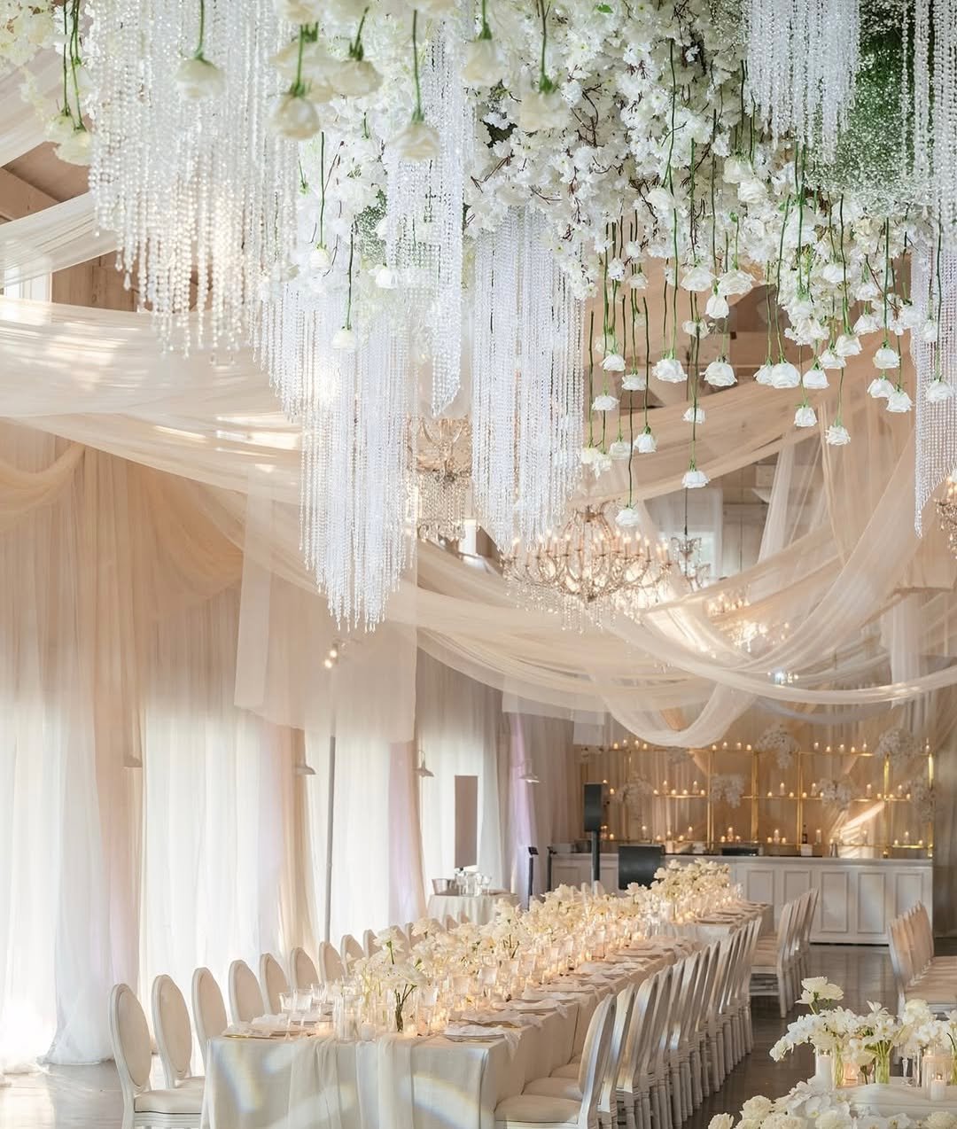 The way those cascading crystal strands and upside-down white roses rain down like couture chandeliers? Pure magic. And the soft ivory draping overhead? It’s giving angelic ballroom energy with a hint of romance novel cover.
