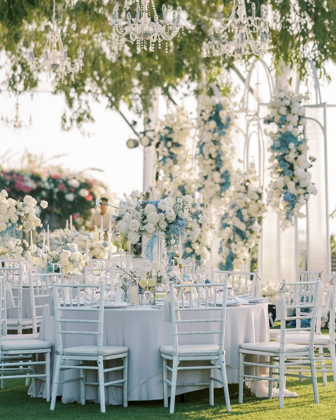 I’m obsessed with the balance here: icy blue against warm greens, classic white chairs grounding all the airy elegance. It’s giving garden fairytale with a couture twist.