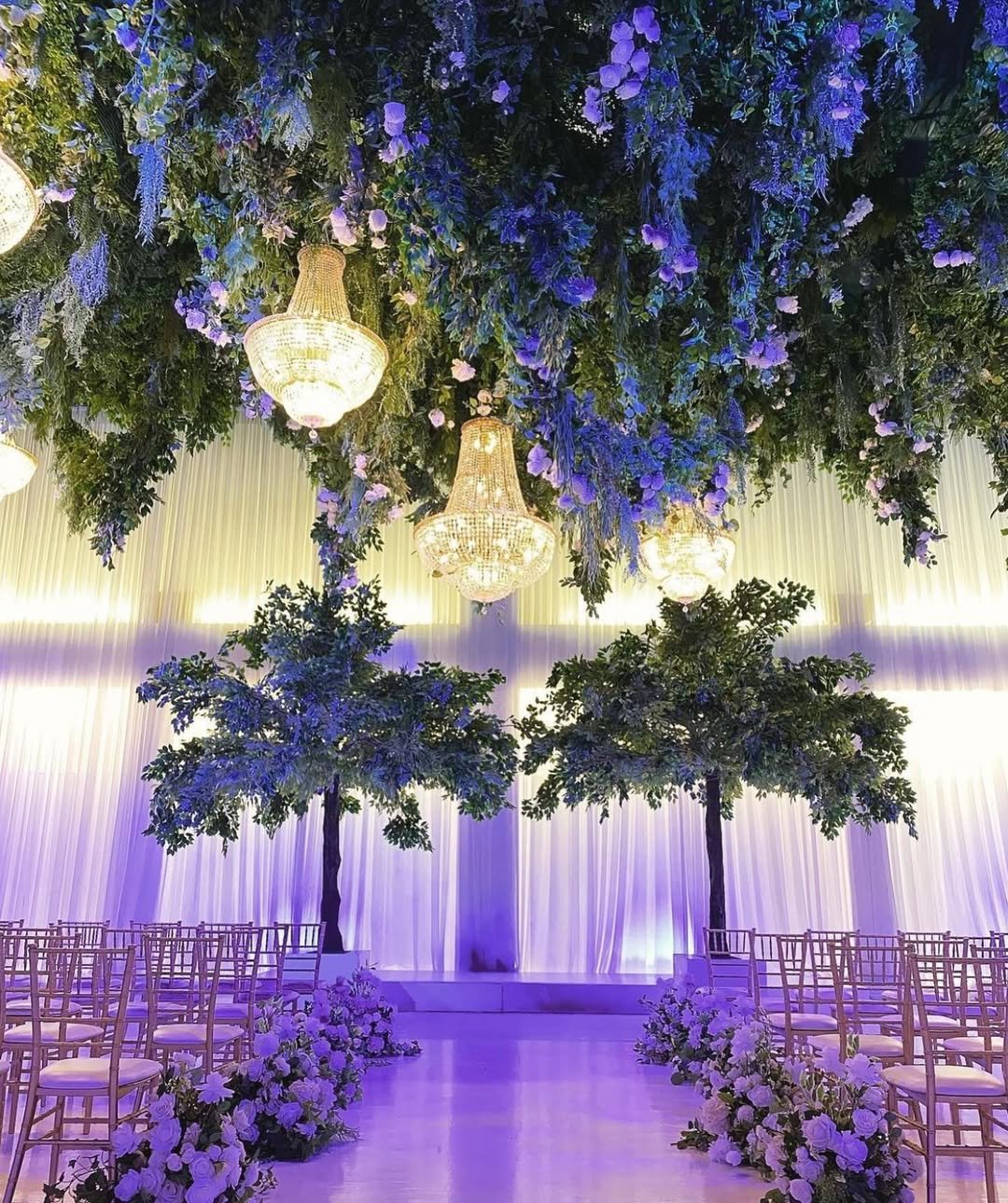 I can’t stop staring at this one—is it a wedding venue or a fairytale forest with a chandelier budget? Draped fabric floats above like soft clouds, and those leafy vines? Chef’s kiss. It’s giving enchanted woodland energy… but make it chic.