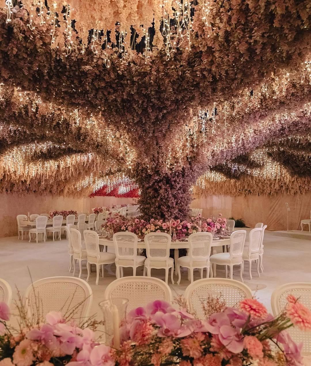 This space looks like a cherry blossom tree had a very glamorous dream and decided to host a wedding inside it. The ceiling blooms, the lighting twinkles, and I’m convinced the entire room smells like spring in Paris.