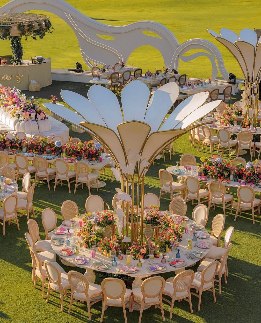 From the oversized sculptural blooms to the riot of color on every plate and petal, this reception is pure serotonin. It’s like spring and couture had a love child—and threw a garden party on a golf course.