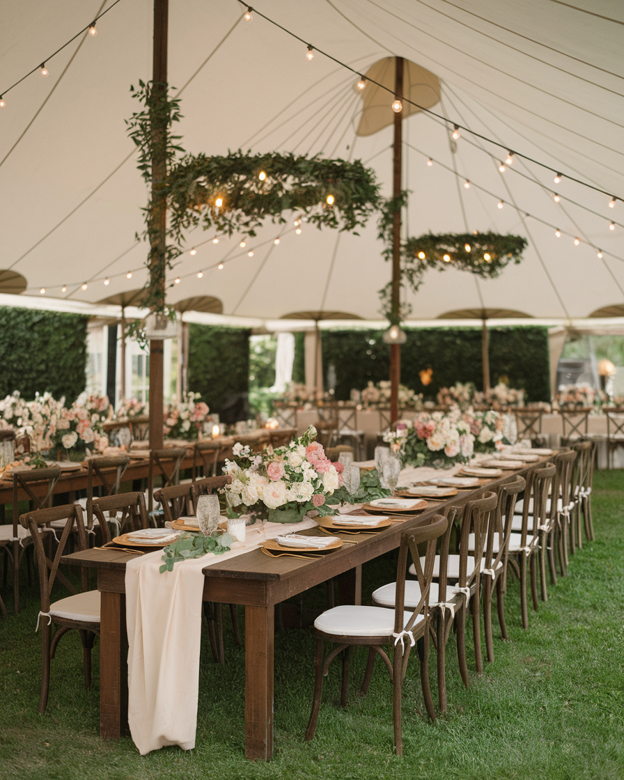 Those greenery chandeliers? Pure magic. It’s giving rustic elegance with just the right touch of romance. I can practically hear the soft clinking of glasses and the buzz of happy chatter under that tent.