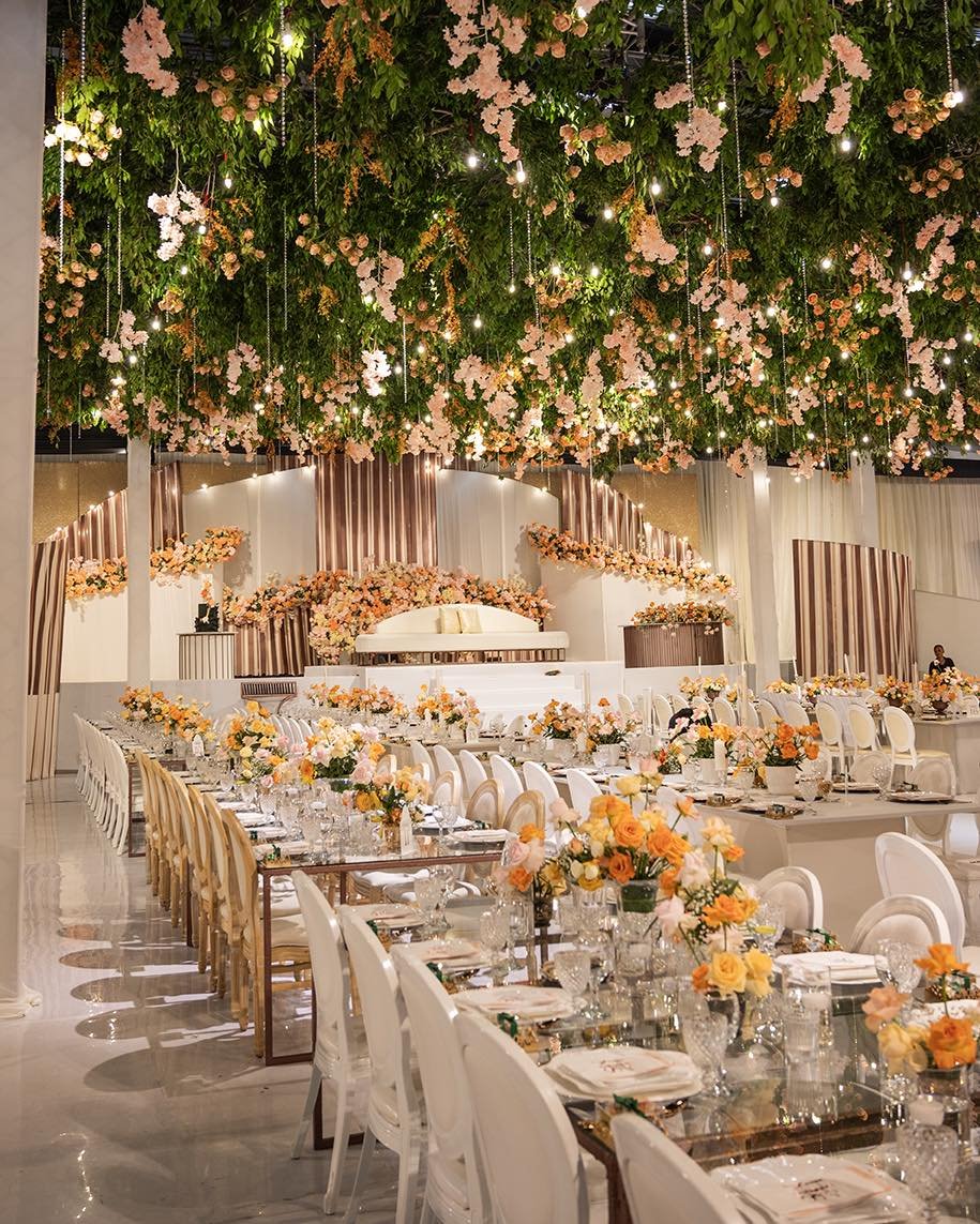 The ceiling was literally dripping with florals—like nature decided to throw her own afterparty. Between the soft peach blooms, twinkling lights, and glassy mirrored tables, everything felt lush, luxe, and lowkey ethereal.