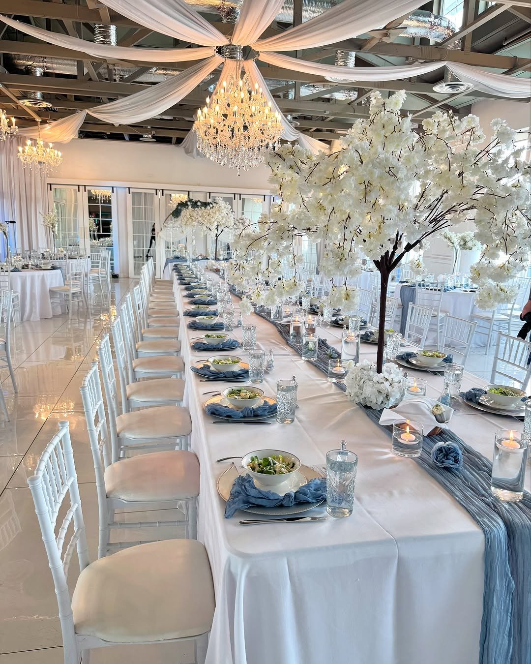 Everything—from the crisp white linen to those frozen-sky blue napkins—feels like a dreamy winter romance, minus the frostbite. And don’t even get me started on the blooming white trees. I mean, how are we not all living under a canopy of faux cherry blossoms at dinner every night?
