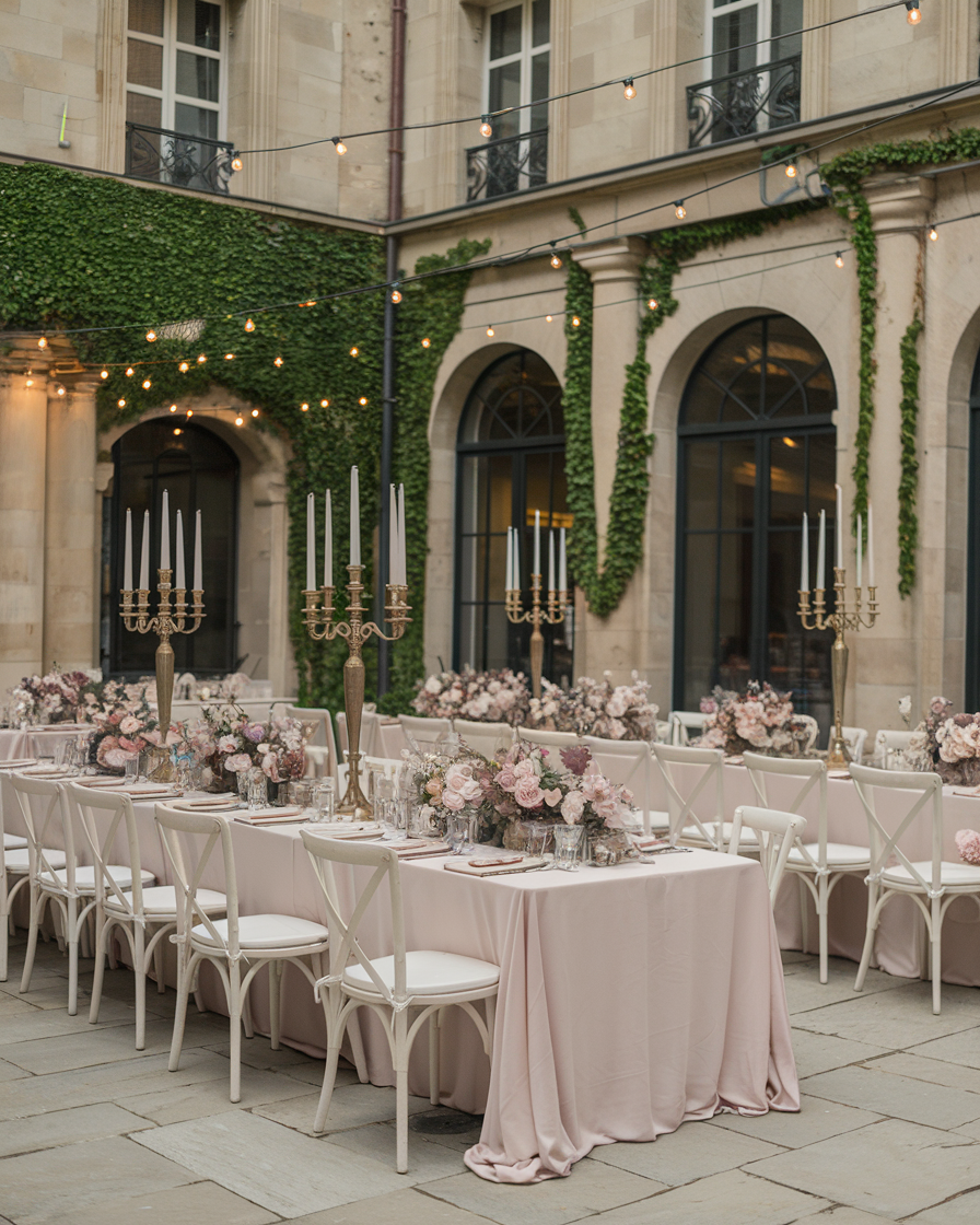 If Château elegance and effortless romance had a lovechild, it would look exactly like this. Soft blush linens cascade to the floor, vintage candelabras flicker with golden glow, and the florals? Think old-world rose garden meets moody poetry.