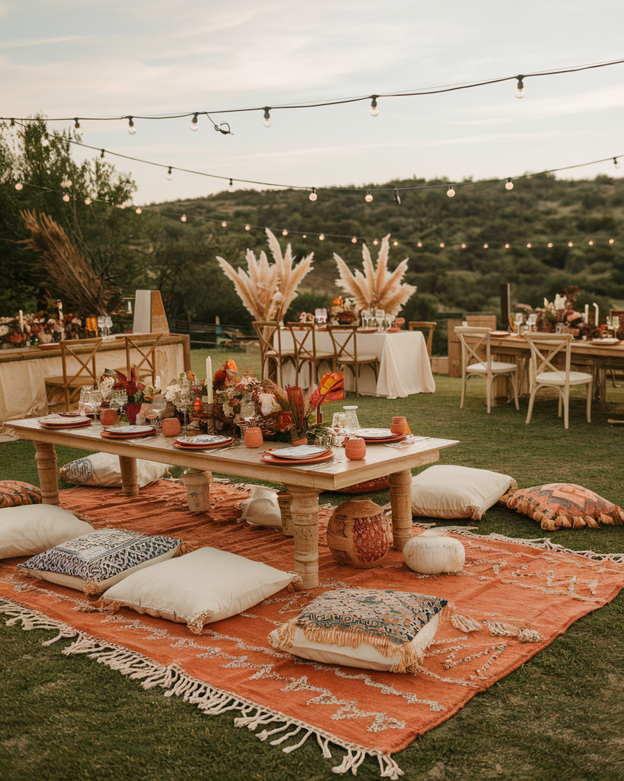 Okay, this setup said “Who needs chairs when you have vibes?” and honestly, I’m not mad. A low-table lounge moment layered with tasseled rugs, Moroccan-style pillows, and terracotta everything? It’s boho bridal bliss—served golden hour side up.