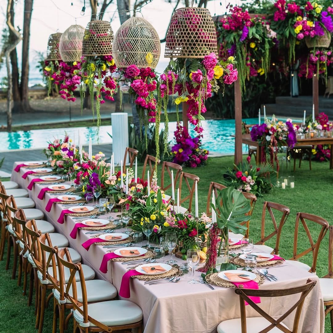 The neon pinks, the rattan pendants, the tropical florals casually overflowing like they just woke up like this—everything about this setup is pure joy. It’s bold, it’s playful, it’s giving “let’s dance barefoot under the stars.”