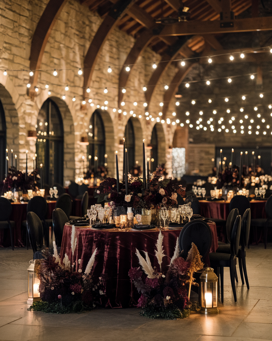 The pampas? The layered textures? The way those string lights reflect off every glass? Pure drama—in the most delicious way.