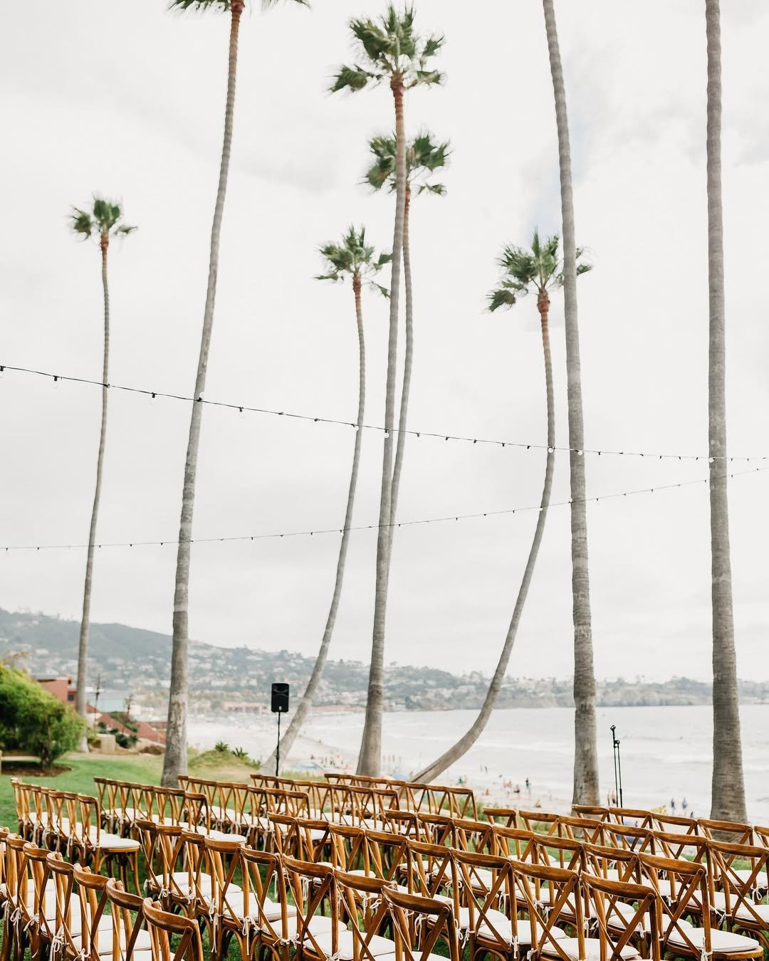 Rows of wooden cross-back chairs line up beneath towering palms, the ocean stretching out in that hazy, cinematic way that makes everything feel suspended in time. It is the kind of setting where you can almost hear the soft rustle of linen dresses and the quiet hum before the vows begin. The string lights overhead add just enough romance without stealing focus from the coastline.