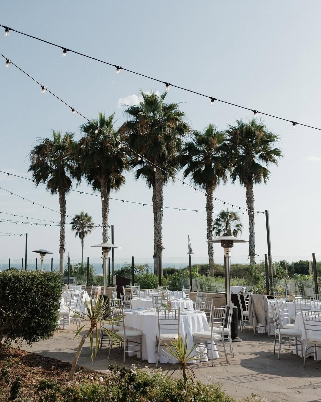 Palm trees sway overhead while string lights stretch across an open-air terrace. Round tables dressed in crisp white linens sit ready for dinner as the ocean hums quietly in the background. It feels like the kind of reception that starts with champagne at sunset and lingers long after dessert.