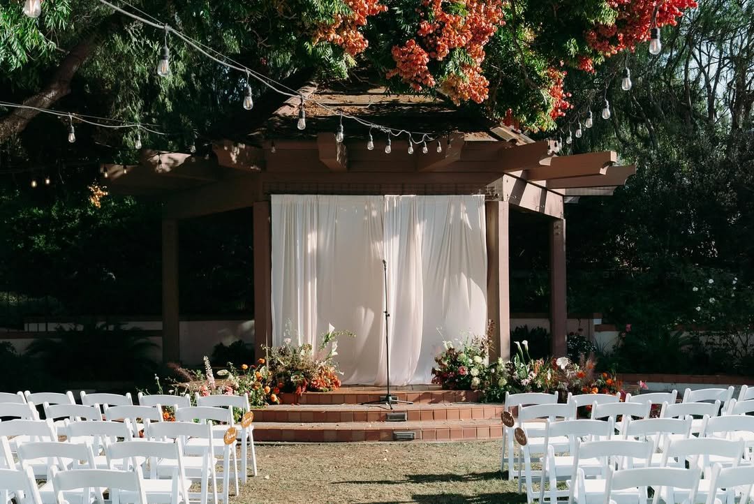 A charming pavilion draped in white fabric anchors this outdoor ceremony space. White folding chairs line the aisle, and warm florals frame the stage beneath blooming trees.