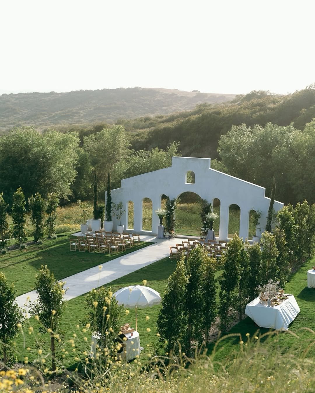 Tucked into rolling greenery, this white stucco backdrop with arched cutouts feels like a hidden Mediterranean chapel. Wooden chairs line a simple aisle, and the surrounding hills create the dreamiest natural frame.