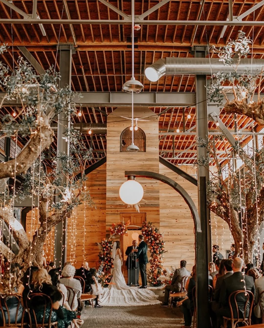 Inside this warm, wood-beamed loft, olive trees twist upward beneath exposed rafters, their branches strung with delicate lights. The ceremony unfolds beneath a circular floral installation, rich with autumnal blooms and candlelit glow. It feels intimate, almost like stepping into a hidden European courtyard tucked inside a city warehouse.