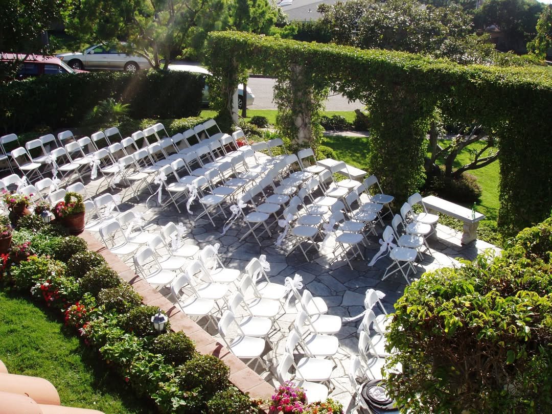 This terraced garden feels private, almost tucked away from the world. White folding chairs arranged on stone pavers, an arbor draped in green ivy, and sunlight filtering through leaves overhead. It is classic in the best way.