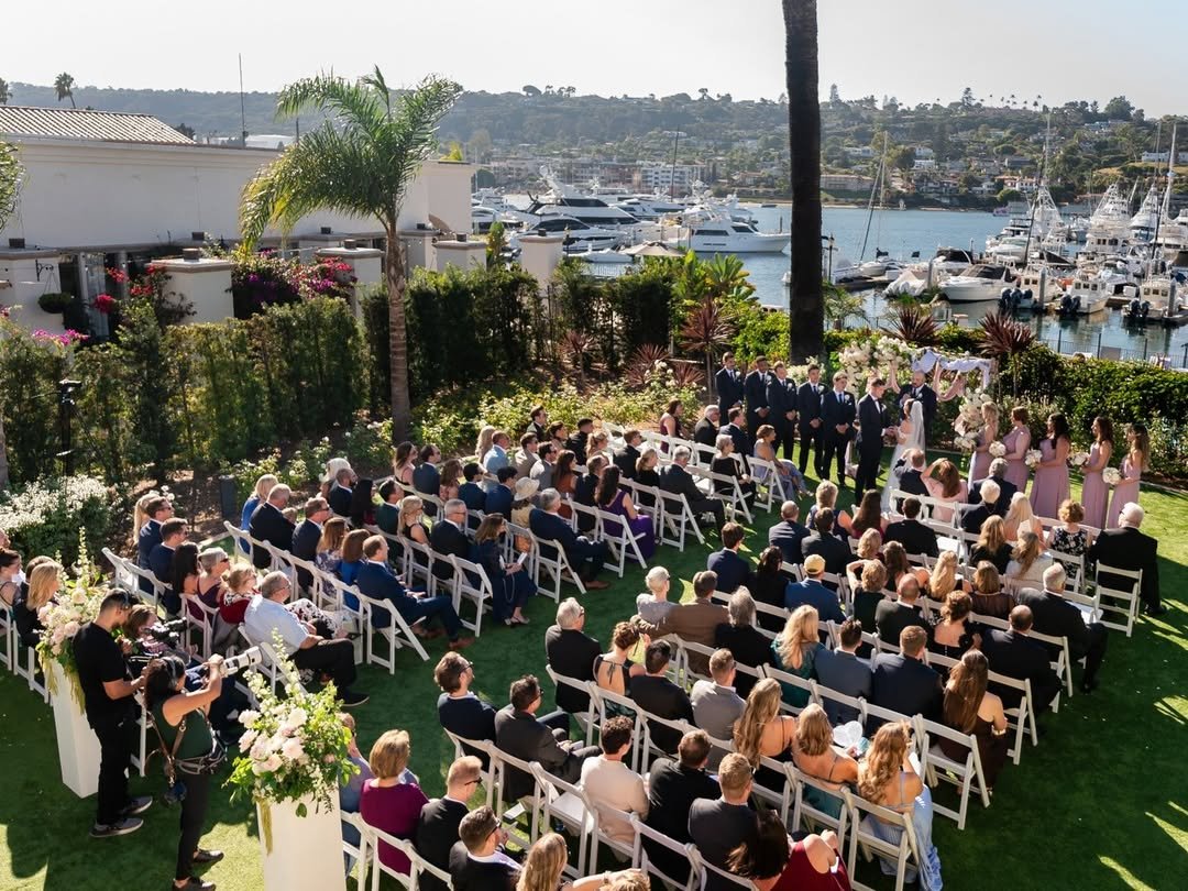 Sunlight pours over a manicured lawn, white folding chairs forming a perfect aisle that leads toward a floral arch set against a sparkling marina. Yachts drift in the background, palm fronds sway overhead, and suddenly the whole ceremony feels like a destination dream without ever leaving home.