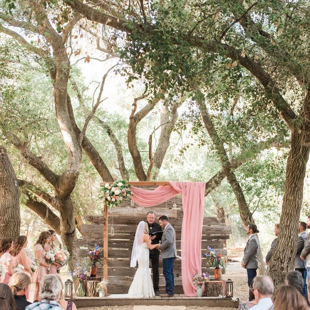 Beneath sprawling trees, a wooden backdrop draped in blush fabric sets a warm, intimate tone. Wildflower arrangements and lanterns bring texture without overwhelming the natural surroundings.
